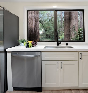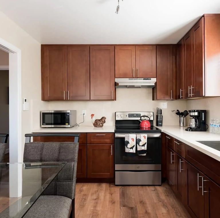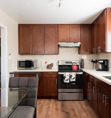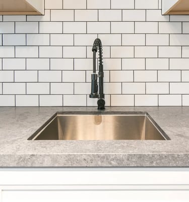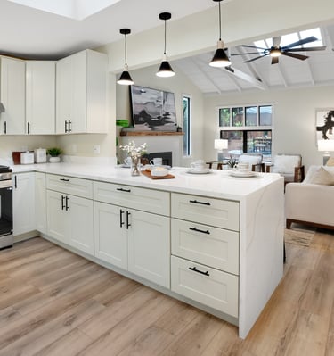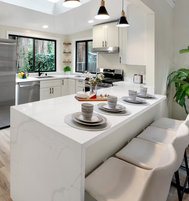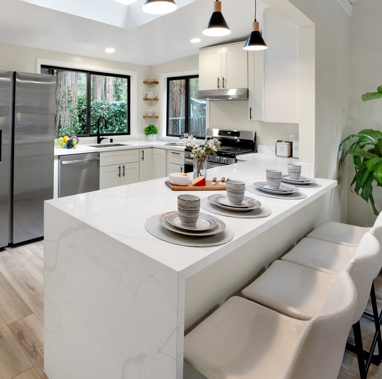 Update your kitchen with sleek cabinetry paired with earthy quartz countertops and optimal design.